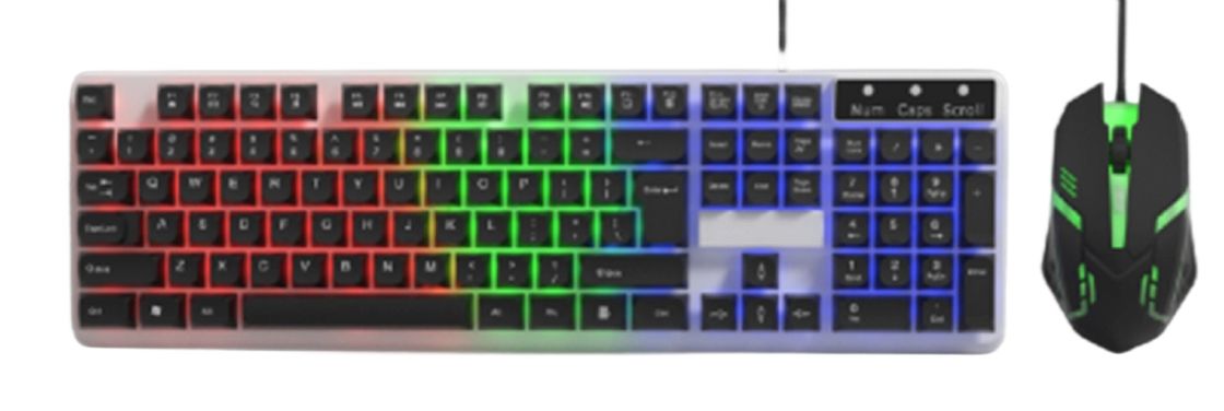 Stylish wired keyboard and mouse combo in rainbow color, featuring a carbon film structure for quiet and responsive typing. The keyboard measures 430.7 × 131 × 30 mm with a 1.4-meter cable for flexible placement. Designed without backlight or breathing light, ideal for users who prefer non-illuminated keys.